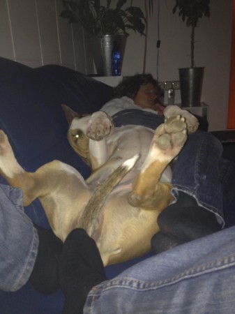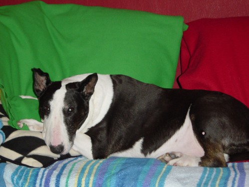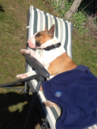 die Zeitung lesen, uns duschen, das Bett machen, die Teppiche saugen oder gerade Mittagessen kochen. Bullterrier sind gemütliche Sofarutscher,